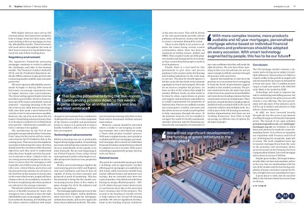 At AMI, we have invested heavily through the last few years to get smarter at selling through our Protection Viewpoint series. The launch of our open websites greenmortageadvice. uk and workinginmortgages. org. uk are windows to allow firms and advisers be ready for a more demanding future. It is critical we maintain our reputation with Treasury and FCA of our challenging but pragmatic approach to issues. The work completed years ago to insulate mortgage firms from the costs in the pensions and investment advice sector incurred via the Financial Services Compensation Scheme, has saved mortgage advice firms in excess of £ 400m.