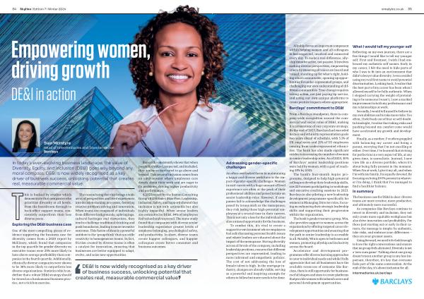 From a Barclays standpoint, there is company-wide recognition around the commercial and social value of DE & I, making it a cornerstone of our corporate strategy. By the end of 2023, Barclays had exceeded its race and ethnicity representation goals two years ahead of schedule, with 5.1 % of UK employees and 21 % of US employees coming from underrepresented ethnicities. The bank has also made significant strides in increasing the number of women in senior leadership roles. As of 2023, 30 % of Barclays’ senior leadership positions were held by women, with a goal of reaching 33 % by 2025.