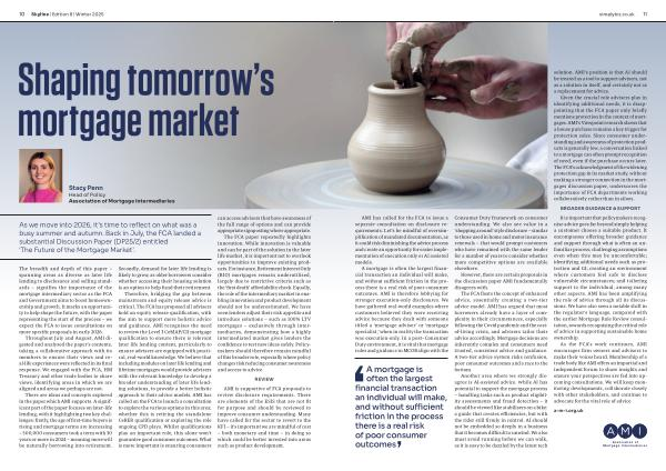 It is important that policymakers recognise advice goes far beyond simply helping a customer choose a suitable product. It encompasses offering broader guidance and support through what is often an unfamiliar process; challenging assumptions even when this may be uncomfortable; identifying additional needs such as protection and GI; creating an environment where customers feel safe to disclose vulnerable circumstances; and tailoring support to the individual, among many other aspects. AMI has been amplifying the role of advice through all its discussions. We have also seen a notable shift in the regulator’ s language, compared with the earlier Mortgage Rule Review consultation, towards recognising the critical role of advice in supporting sustainable home ownership.